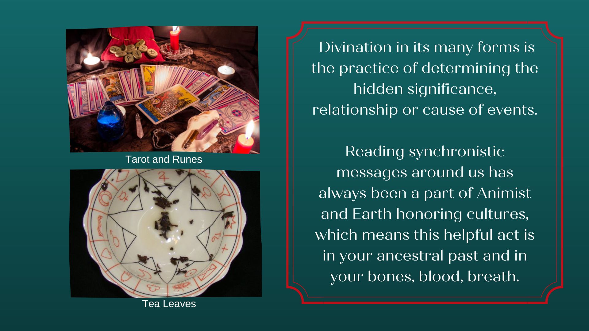 Divination comes in many forms, and is present all over the world. Reading the synchronistic messages around us has always been a part of Animist/Earth honoring cultures, which means this practice is in your ancestral past. Humans have always lived with the elements, and in an Animistic world this means that the wind, water, fire and various forms of earth can bring us messages when we need them most. Today, we can remember these ancestral and personal ways to read the signs, patterns, and synchronicities in our lives, however the messages come.